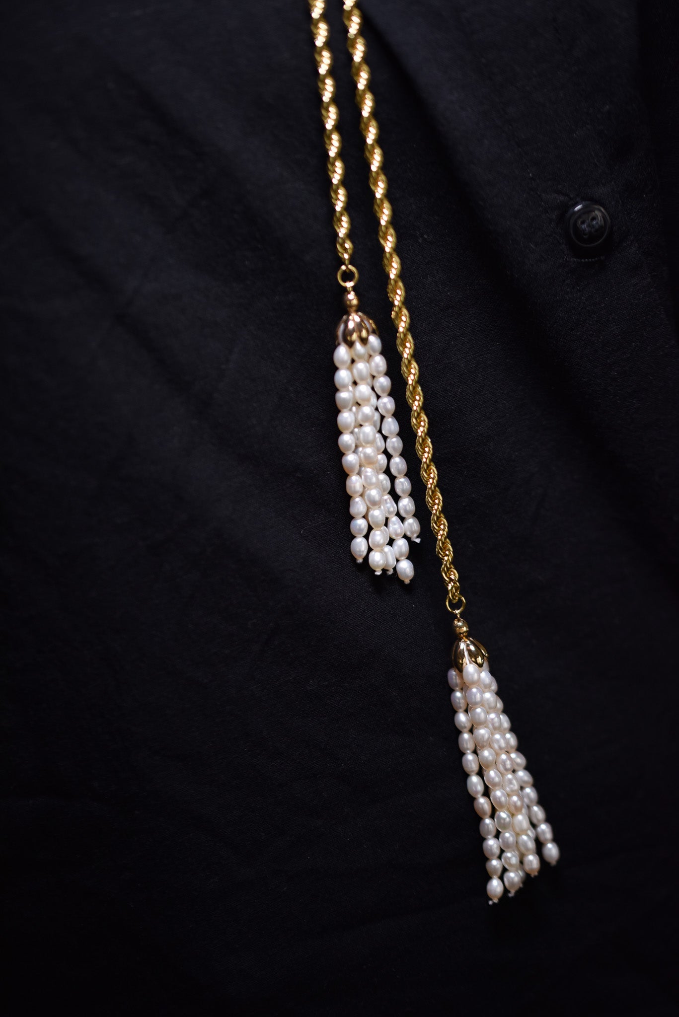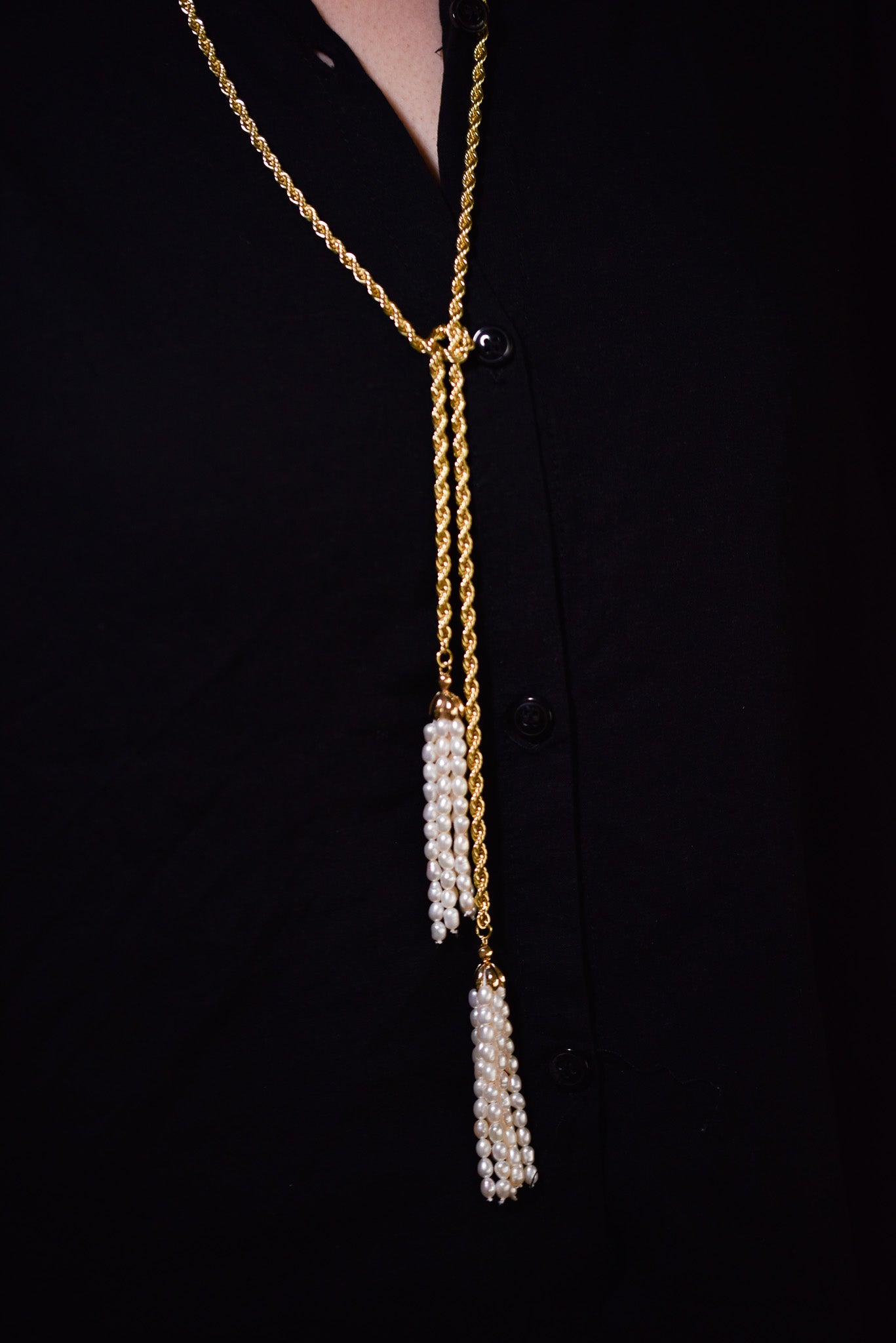 Make a statement of timeless beauty and sophistication with our Gold and Pearl Tassel Necklace. Order yours today and adorn yourself with elegance and grace.