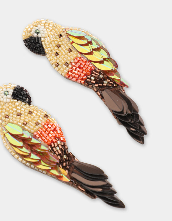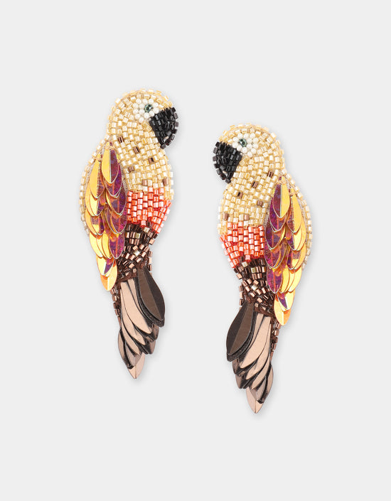 Inspired by the colourful parrots found in tropical south America, these gold Ara Earrings are made with a combination of micro beads and long sequins that imitates their long and shimmering tails.